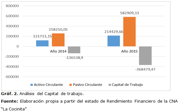 Como se observa en el gráfico 2, la CNA “La Cocinita” en los años 2014 y 2015 tiene más pasivos circulantes que activos circulantes mostrando un capital de trabajo negativo, lo que indica que existen problemas para pagar las obligaciones a corto plazo. Esto se evidencia en las deudas envejecidas que poseen con la Empresa Mayorista a 90 días, negociadas con letras de cambio hasta septiembre del año 2016, producto a las ventas desmesuradas de cigarro de los años 2014 y 2015, respectivamente.