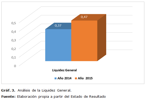 El gráfico 3 muestra la liquidez general en los años 2014 y 2015, donde “La Cocinita” dispone de $0.37 y $0.47 de activo circulante para pagar cada peso de pasivo circulante u obligaciones a corto plazo, incluso cuando este indicador creció $0,10 muestra que esta cooperativa puede declarase en suspensión de pagos.