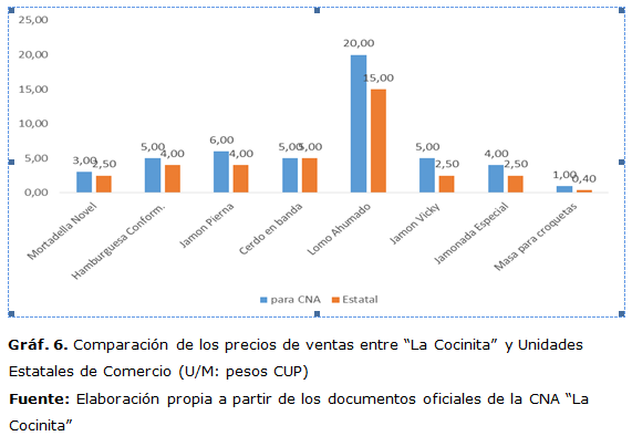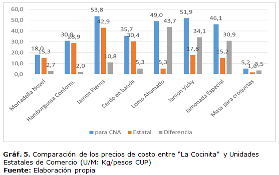 El gráfico 5 presenta la comparación de los precios de costo entre la CNA y las unidades estatales de comercio. En una muestra de algunos de los principales productos que comercializan, la diferencia promedio entre los precios oscila sobre los $11.16, indicando que en productos como lomo ahumado, jamón viking, jamonada especial y jamón pierna se encarece su comercialización, incidiendo de forma directa en las ventas de la entidad.