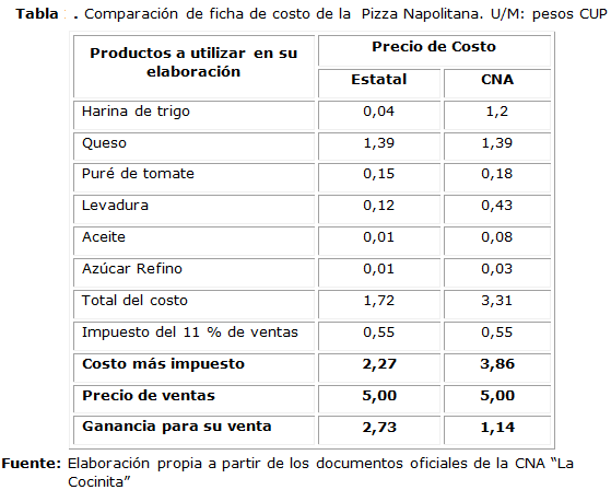 Otro ejemplo válido para continuar argumentando sobre las condiciones desfavorables en que se desarrolla la comercialización en la CNA es la tabla , que describe el costo de las materias primas que se emplean en la elaboración de la Pizza Napolitana. En ambos casos se venden a $5.00; sin embargo, mientras que el Estado gana $2.73, la “La Cocinita” gana $1.14, cifra que representa menos del 50% de las ganancias que obtienen las entidades estatales por este producto.