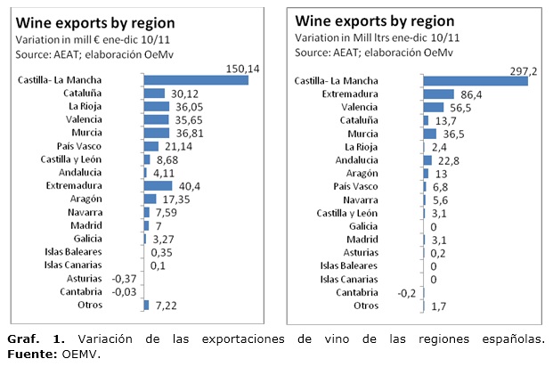 La dinámica en los últimos años ha sido exponencial y el crecimiento en este último año 2011, ha sido espectacular como puede verse en los gráficos, siendo CLM la región que ha presentado mayor dinamismo comercial en los mercados mundiales de todas las regiones españolas (incluso cuando la ratio se hace en el valor de las exportaciones) (gráfico 1).