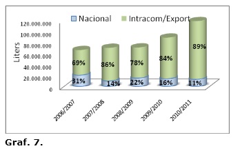 En el último año 2011, además, el proceso de elevación de los precios base a granel, ha propiciado que incluso en los vinos con referencia de origen de calidad, el proceso de embotellado y envasado se haya visto desplazado por el buen comportamiento de las ventas a un precio más elevado, sin necesidad de acometer las inversiones de promoción y comercialización.