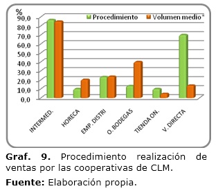 Como puede comprobarse en el gráfico, de las cooperativas seleccionadas en la muestra, todas realizan ventas a granel, representando el 89,1 % de sus ventas totales, curiosamente el 80% han llegado a embotellar y utilizar marca propia, pero apenas representa el 4,6% de su facturación, lo que implica que la marca y la decisión de embotellar les ha servido más como imagen que como elemento de avance en el volumen de negocio.