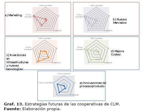 Las cooperativas de CLM, no creen necesario el desarrollo de nuevos productos y optan por la expansión más cuantitativa que cualitativa en introducirse en nuevos mercados y en utilizar nuevos canales de comercialización (gráfico 14). Aunque resalta la necesidad, interiorizada, de hacer inversiones en marketing y comercialización, aunque luego no se lleva a la práctica en los momentos actuales.
