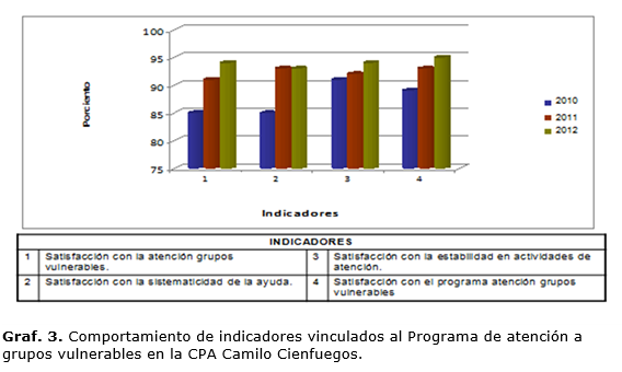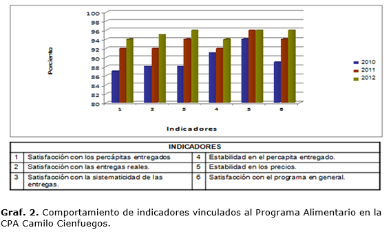 El Programa Alimentario, tan sensiblemente expresado, como una necesidad primordial, reconocida tanto por su manifestación numérica, como por su significación social, muestra avances, alcanzando impactos muy positivos, pero mostrando ingentes esfuerzos en la gestión venidera, para impactar de forma más contundente en sus beneficiarios. En el Gráfico 2 se puede apreciar el comportamiento ascendente de este programa de acuerdo al nivel de satisfacción expresado por sus asociados.