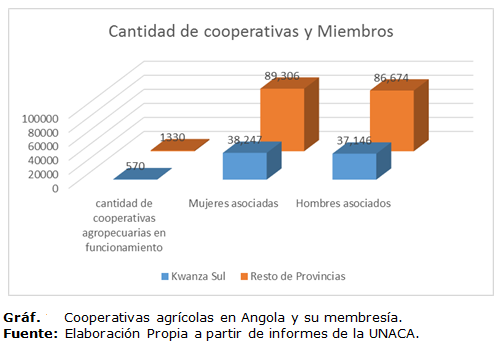 En Angola, las cooperativas agropecuarias, en funcionamiento, suman un total de 1900, forman parte de ellas 251.401 miembros; de ellos, 127.580 mil son mujeres, las que son atendidas por la UNACA, el Ministerio de la Agricultura, la Asociación para el Desarrollo Rural y Ambiente (ADRA). En el caso de Kwanza Sul son 570, para un 30% del total nacional, tienen 49.76 mil miembros, de los cuales 25.000 son mujeres (ADRA, 2011).