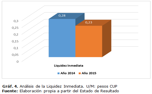 Con el cálculo de la liquidez inmediata (ver gráfico 4) se supo que por cada peso de deuda a corto plazo la cooperativa cuenta con $0.28 y $0.23 de activos disponibles y realizables, existiendo una disminución en el año 2015 con respecto al año 2014 de $0.05, situando a la cooperativa en una situación de peligro donde es posible que se presenten problemas para atender los pagos.