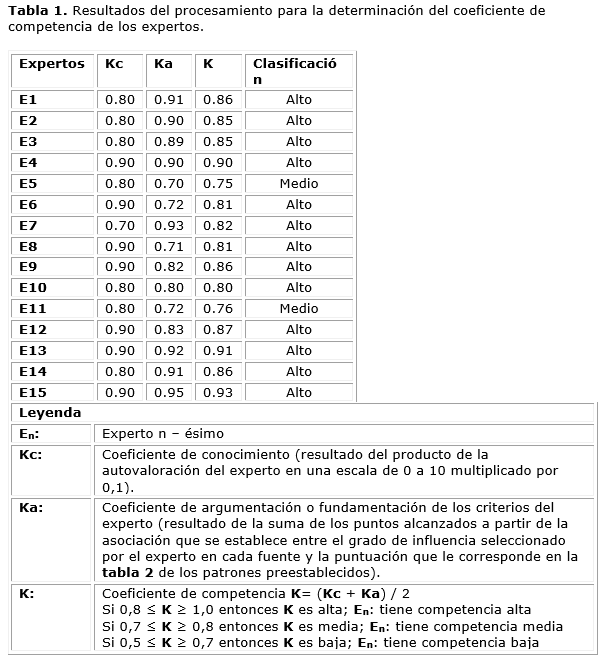 Posteriormente, el grupo coordinador seleccionó los posibles candidatos en función de dos dimensiones: cualitativa, atendiendo al dominio y experiencia en el tema, la posición, responsabilidad, voluntad y compromiso de participar en todas las rondas y cuantitativa, donde se define el tamaño de la muestra, en función de los recursos medios y tiempo disponible. Se identificaron 22 especialistas inicialmente, reduciéndose a 15 expertos a partir de la autoevaluación que cada uno refirió sobre diversos aspectos, para determinar el coeficiente de competencia en el tema de investigación. Esto se realizó a través de la metodología propuesta por el Comité Estatal para la Ciencia y la Técnica de la URSS en 1971 Blasco, y otros, (2010). En la tabla 1 se aprecia el resultado del procesamiento de la encuesta de autoevaluación aplicada al grupo de expertos. La experiencia promedio de los mismos es de 27 años, el 54 % es especialista en el tema y el resto son licenciados, másters y doctores en las Ciencias Económicas, Ciencias de la Educación y en Ciencias de la Nutrición, lo cual le dio un carácter multidisciplinario al proceso. El coeficiente de competencia promedio del grupo es de 0.84, lo que implica un grado alto e incluyen a todos los candidatos con un coeficiente medio de competencia. (Ver tabla 1 y 2)