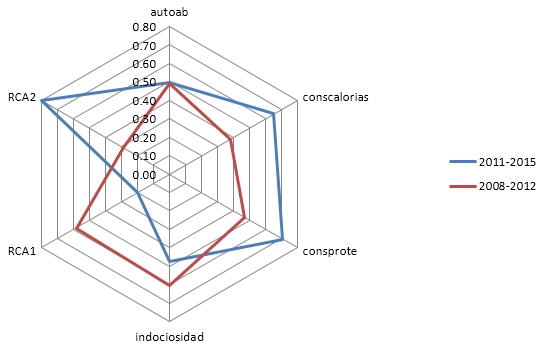 The Food Security dimension (Graph 3) experienced an advance of 0.08, explained by the fact that of the six indicators that make it up, four of them showed progress. They were: calorie consumption at 0.27, self-sufficiency at 0.01, protein consumption at 0.24 and less productive land at 0.51; very productive land fell by 0.38, the idleness index at 0.13; progress in indicators of protein and calorie consumption was the result of the sale of pork at affordable prices, which was widely accepted in the pine population. The low prices of pork were produced by the increase in pork production, which was a response to the implementation of the experiment of selling agricultural inputs to farmers, which included animal feed.