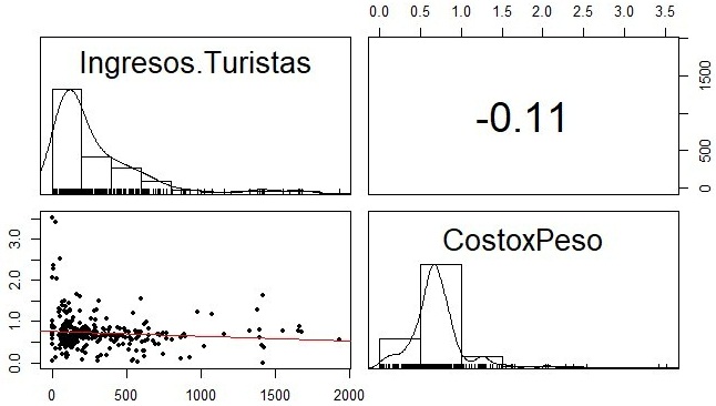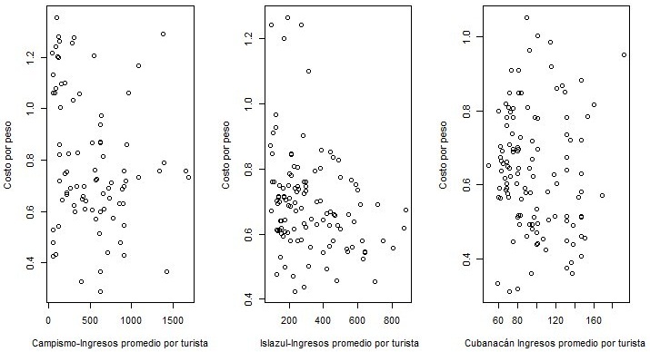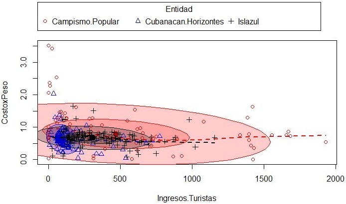 Pearson's correlation coefficients between the dependent variables (cost per peso and income per tourist), analyzed in the institution of Campismo and the Cubanacán and Islazul Hotel Chains were -0.20436, -0.13801 and -0.29271 respectively, showing no significant linear relationship between these variables (significance test with value p>0.05). This result, however, is contrary to what would be expected as a result of good tourism management. In figure 2, the above-mentioned can be seen.