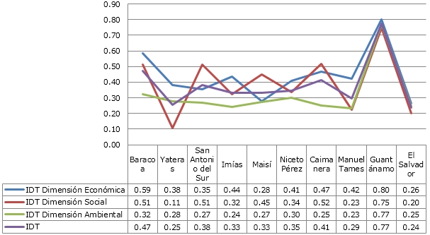 En función de esto, una vez recopilada la información y aplicados los pasos metodológicos para la determinación de las desproporciones, se pueden observar en el gráfico 1 los resultados obtenidos. Los tres municipios que mayor IDT presentan en orden consecutivo son Guantánamo, Baracoa y Caimanera. En el caso de Baracoa y Caimanera inciden positivamente sus valores asociados a la dimensión social. Los municipios con menor IDT son El Salvador, Yateras y Manuel Tames los que generalmente presentan los valores más bajos en todas las dimensiones, destacándose el bajo valor que posee Yateras en la dimensión social.