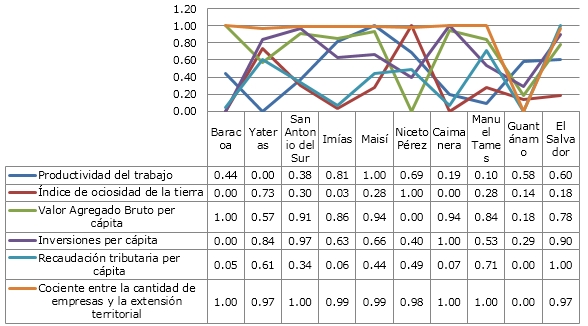 En el caso de la dimensión económica (Gráf. 4) las mayores desproporciones en cuanto al índice de ociosidad de la tierra son de los municipios Yateras y Niceto Pérez, en cuanto al valor agregado bruto per cápita "Baracoa, San Antonio del Sur, Maisí y Caimanera", en el caso de las inversiones per cápita "Baracoa, San Antonio del Sur, Maisí y Caimanera", sobre la recaudación tributaria per cápita "Manuel Tames" y en la productividad del trabajo los peores valores los tienen Imías, El Salvador y Maisí.