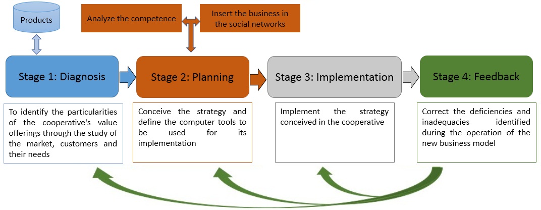 The strategy is based on the use of the social commerce modality as a fundamental means to insert the offers of the agro-livestock cooperatives in the digital market. This type of trade is based on the use of Internet social networks to establish online business relationships. This trade modality was used because Internet social networks are widely used by the Cuban population and facilitate the creation of profiles and digital sites for business. The stages that make up the strategy are described below: