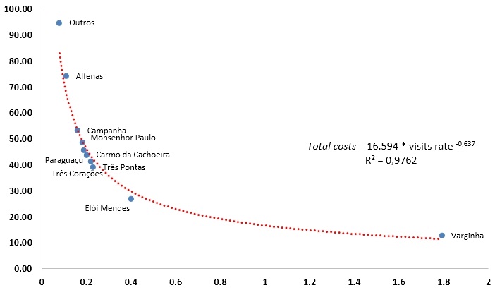 By comparing the generic Marshallian demand function with the inverse exponential function found in this study, which has the form Total costs = 16.708 visits -0.635, whose determination coefficient is approximately 95%, we can assume the feasibility of the curve fit found.