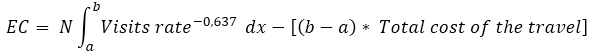 However, to estimate the value of the Total Wish (TW) to be paid by park visitors, the following expression defined above is used for the Consumer Surplus of all visitors in the region, obtaining the following result: