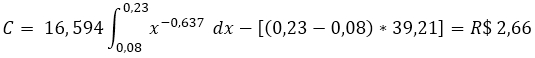 If it is taken the city of Três Pontas as an example, we observe that its upper limit for the rate of visits is 0.23 and the lower limit is 0.08, whose value remains constant for all regions. The parameter of the estimated function is 16.594, the rate of increase is -0.637 because it is an inverse exponential function and the value of the total travel cost associated with this city is R$ 39.21. With these data, the calculation of the Consumer Surplus for the city of Três Pontas can be obtained as: