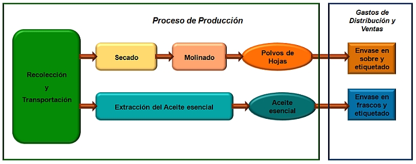 La producción de aceites esenciales comenzó cuando se recibieron hojas recolectadas en el laboratorio, tal y como se explicó anteriormente. A continuación, se procedió a la segunda fase que se definió, para este proceso, como fase de Extracción del aceite; en esta, las hojas seleccionadas fueron introducidas en agua destilada y se sometieron a un proceso de hidrodestilación, del cual se obtuvo el aceite esencial y, con ello, concluyó el proceso de producción. El aceite obtenido se envasó en frascos con etiquetas; esta fase, donde se envasó el producto final, se le conoce como Distribución y ventas (Fig. 1).