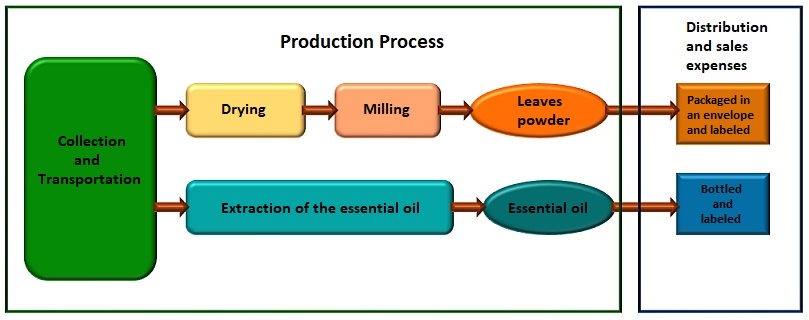 The production of leaf vegetable powders and essential oils from botanical species was developed in two processes that are independent, as shown in figure 1, but that have in common their first phase, which began with the collection of the leaves of the species in the Botanical Garden of Cienfuegos, which were delivered free of charge to be transported to the laboratory where the processes were developed. This first part of the process was considered as the collection and transportation phase and corresponded to the assurance of the fundamental raw material that was used for these productions. At the end of the first phase of the process, the production of vegetable powders from leaves and essential oils from botanical species were separated, since they are two processes that go through their phases, in which expenses are incurred on a different basis.
