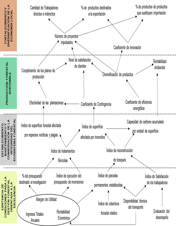 Se conformó el mapa de relaciones causa-efecto teórico (Fig. 2), se tomaron como base los criterios e indicadores de gestión forestal por la excelencia, que en este caso son los que describen el proceso de formación de valor, mediante una serie de relaciones entre los objetivos e indicadores de cada criterio, lo cual contribuye, desde esta perspectiva, a perfeccionar el proceso de gestión, su conducción y toma de decisiones oportunas.