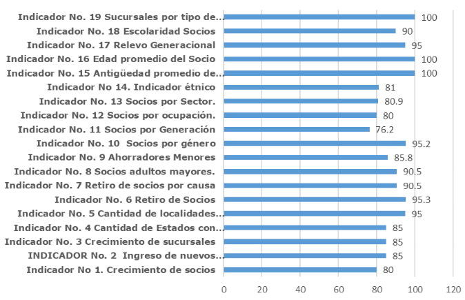 En la primera variable, se definieron tres indicadores (Inversión en educación financiera, Educación cooperativa y Empleados) que al informar los montos económicos destinados da una imagen de la prioridad que da la cooperativa a estas actividades. En la segunda variable, se determinó el indicador Resultados económicos contra capacitación que expresa por cada peso invertido en capacitación del personal de la cooperativa cuánto es el incremento en ahorro, crédito e inversión. En la tercera variable se define el indicador Acciones y proyectos de información y comunicación, ejecutados con empleados y directivos. La cuarta variable está conformada por dos indicadores Acciones y proyectos de capacitación ejecutados con el personal y el indicador Empleados, con apoyos para capacitación.