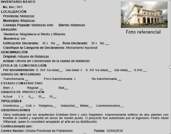 Once the assets in optimal conditions for the creation of value in the city have been identified, an inventory card must be prepared for each property; in this card, each of the criteria will be developed more explicitly and other aspects of importance for their enhancement will be analyzed; as an example, the inventory card for the Matanzas Customs House is prepared (Fig. 2).