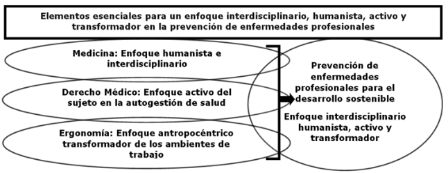 En este sentido, los autores coinciden en la pertinencia de un enfoque en la prevención de enfermedades profesionales, centrado en las necesidades humanas, que considere la participación activa y transformadora de todos los sujetos involucrados en la actividad de trabajo, independientemente del lugar que ocupen en el proceso productivo o de servicios. Semejante propósito demanda una proyección desde la interdisciplinariedad, entendida esta como el efecto de integrar varias disciplinas para la solución de problemas complejos, vinculados al estudio y transformación de la realidad, a partir de un trabajo colaborativo e innovador.