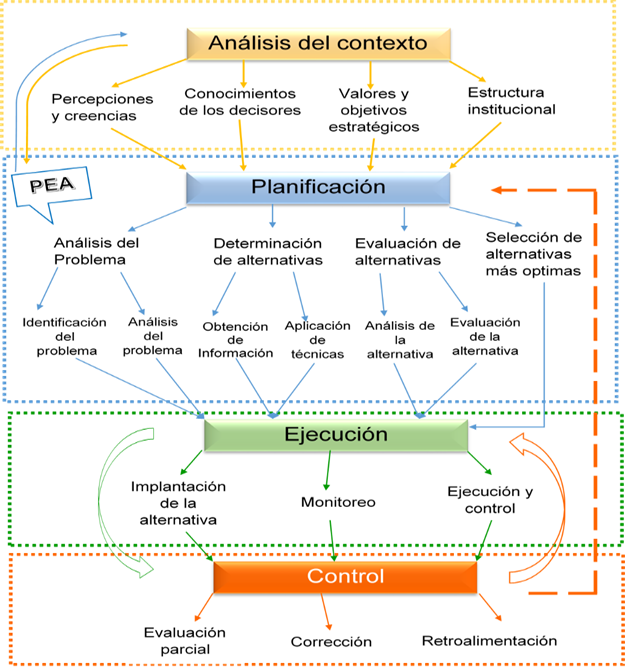 En la literatura consultada, autores como Morán y Bianchi (2005) trabajan un modelo de toma de decisiones ambientales gubernamentales en el que incluyen cuatro niveles: Contexto Ambiental y Social, Planificación y Evaluación, Modo de la toma de decisiones y Acciones de decisión. Se perciben similitudes relacionadas con el análisis del contexto, sin embargo, no se aprecia en la etapa de Planificación y Evaluación elementos relacionados con la determinación de sus alternativas de solución del problema seleccionado, por lo que podrían presentarse dificultades, dedicando tiempo y recursos a problemas de difícil solución o escasez de recursos, de pequeño impacto o dejar fuera otras variables que podrían indicar la selección de aquellos problemas que podrían afectar el cumplimiento de objetivos estratégicos. De igual forma, no se percibe la posibilidad de corregir determinadas soluciones tomadas que no surtan el efecto deseado.