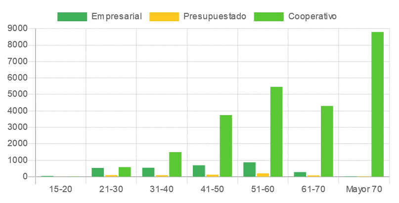 The distribution of human resources by sector (Fig. 5B) is as follows. The budgeted sector has a total of 619 people. The business sector has 3910 people employed to carry out its functions. In the cooperative sector, approximately 24,397 people are employed in the sowing plans. This behavior is the most dynamic within the sector, so it is more difficult to be precise, but even so, this system can be used to identify the human resources that have been hired by the different cooperatives and associated units.