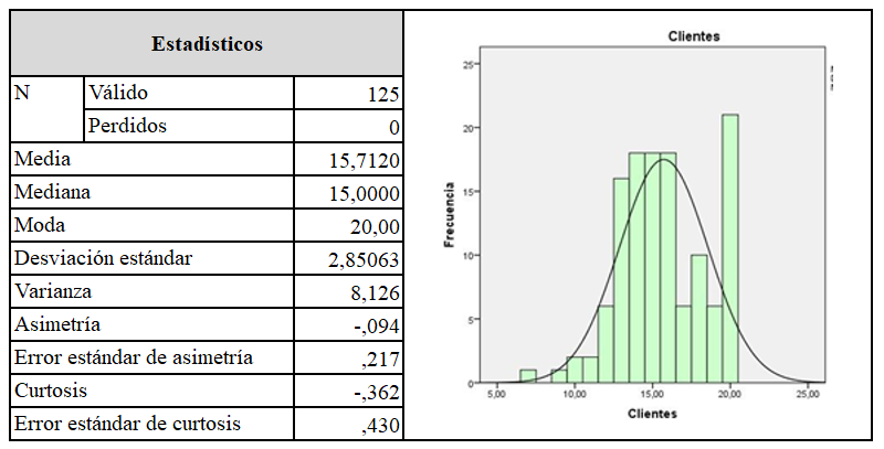 Graph 2 shows the amount of data analyzed from the sample, the value of the asymmetry is -0.964 and indicates that the Client variable has a negative asymmetry because it is above the arithmetic mean and its kurtosis value -0.362 indicates a platykurtic curve because there is a lower percentage of data concentration around the mean, with a variance of 8.126, which indicates a high dispersion of the data analyzed.