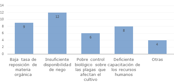 La pregunta número uno arrojó el resultado que se muestra en la figura 2, donde se evidencia que las tres causas más comunes que provocan la disminución de las capacidades de producción de hortalizas en el municipio de Cienfuegos, según los 13 especialistas, son, en primer lugar, insuficiente disponibilidad de riego, seguido está la baja tasa de reposición de materia orgánica y, por último, la deficiente capacitación de los recursos humanos.