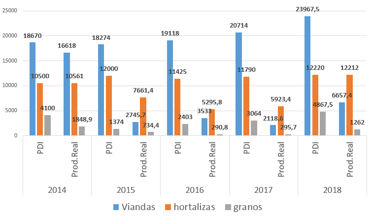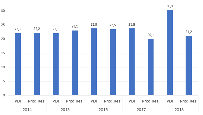 Graph 1 shows the actual production behaviors for the years 2014-2018. If it is assumed that the productive results constitute one of the elements to evaluate the effectiveness in the design, goal setting and execution of the PDIs, then we have that: