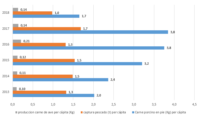 Poultry production per capita does not exceed kg/inhabitant with a rather discreet growing behavior, going from 0.1 kg/inhabitant to 0.14 kg/inhabitant at the end of 2018.
