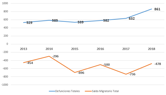 To support the above approach, Figure 9 reflects the number of deaths and the migration balance from 2013-2018. The figures for the number of deaths increase each year. At the beginning of the stage there were 529 deaths with an increase in absolute value of 332 people at the end of 2018, which represented a growth of 161.7% at the end of the period.