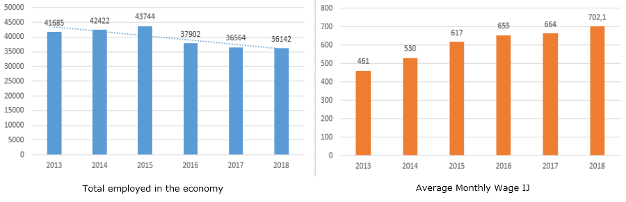 Graph 10 shows the evolution of employment between 2013 and 2018. The behavior expresses a decreasing trend, fluctuating between 41 685 and 36 141 employed, with an average absolute frequency in the period analyzed of 1 109, which represented a decrease of 2.63 % on average in the stage studied. Wages, on the other hand, experienced a discreet growth of 8.9% for the same period, while in absolute values, on average, they grew by 48 CUP, from 461 CUP to 702.1 CUP. These figures are among the lowest at the national level, a reason that also reveals the exodus of professionals from the territory.