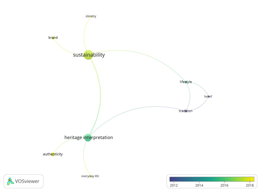 En consecuencia con lo anterior, se realizó el análisis de palabras clave de toda la producción científica disponible en Scopus sobre turismo creativo. Se obtuvo un total de 783 palabras clave, que fueron remplazadas por el nombre de la dimensión correspondiente para el análisis de densidad (Fig. 3). El mapa muestra la estructura general del tema respecto a las dimensiones, recursos, significado y creatividad. Se muestra la creatividad como área más densa, reflejado por 108 co-ocurrencias, que representan la fuerza de asociación de los ítems. En segundo lugar, los recursos (99 co-ocurrencia) y por último la dimensión significado con (47 co-ocurrencias).