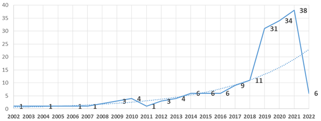 The Scopus search yielded a total of 166 articles. In the graph (Fig. 1) the trend line shows the exponential growth of publications. Despite the youth of the subject, there is evidence of a sustained and growing interest of authors in creative tourism, especially in the last two years, where the importance of creativity in tourism has been recognized by the World Tourism Organization as a challenge within the necessary synergy between culture and tourism to achieve authentic and innovative experiences.