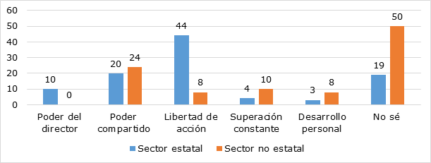 Tal y como puede apreciarse en ambos sectores, el consenso radica en considerar al empoderamiento como poder compartido entre la dirección y los trabajadores, no obstante, en el sector estatal se asocia mucho más a la libertad de acción y al poder de directivo. Aunque en menor escala, también se destaca el considerar al empoderamiento como aquello que permite dotar de poder a los trabajadores, desde un plano individual. Además, se asocia con autonomía, dirección, delegación, cambio y cooperación. No obstante, como puede apreciarse, existe un porcentaje elevado de trabajadores que expresan desconocimiento total sobre el término.