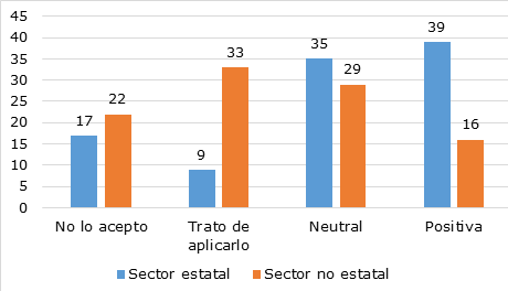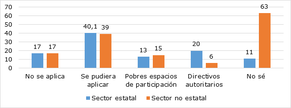 En el caso del sector no estatal, se evidencia claramente que la mayoría de los sujetos (63,3 %) no saben de la aplicación del término en su centro de trabajo, sin embargo, en ambos casos (39 % y 40,1 %) afirmaron que sí se aplica esta categoría en su organización, mientras que otros alegan que es un proceso difícil de aplicar debido a los pobres espacios de participación y a directivos autoritarios.