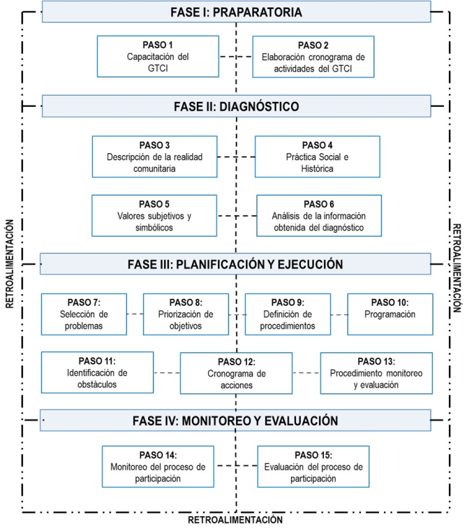 El procedimiento cuenta con cuatro etapas: Fase I Preparatoria, Fase II Diagnóstico, Fase III Planificación y Ejecución y Fase IV Monitoreo y Evaluación. Para su materialización, se apoya en 15 pasos. Estas cierran con un plan de acciones dirigido a la participación de la comunidad por cada una de las fases mencionadas. Esta herramienta demuestra el valor de la contribución comunitaria como uno de los insumos a utilizar por el Gobierno Municipal para una gestión eficiente del desarrollo local. Lo anterior responde al Plan Nacional de Desarrollo Económico y Social hasta 2030 (PCC, 2017) el que, en uno de sus ejes estratégicos, el relacionado con Transformación productiva e inserción internacional, en su objetivo específico número 8, expresa: