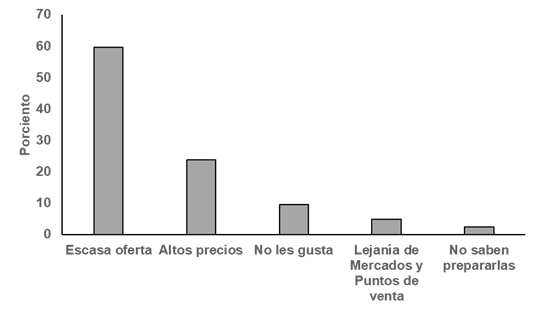 Among the main reasons why they almost never consume vegetables, the scarce supply (59.5 %) and high prices (23.8 %) stand out (Graphic 2).