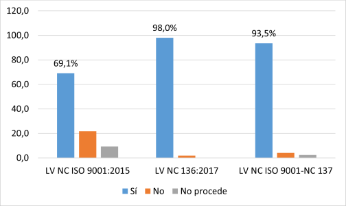 De igual forma, existe una tendencia mayor hacia la integración del sistema de gestión ambiental con base a la NC ISO 14001:2015 y el Sistema de Gestión de la calidad, según la NC ISO 9001:2015, aunque esta se ha extendido hacia la integración del Sistema de Seguridad y Salud en el Trabajo con referencia a la NC 45001:2018 y el Sistema de Control Interno basado en la Resolución 60/2011 de la Contraloría General de la República (Gómez et al., 2018).