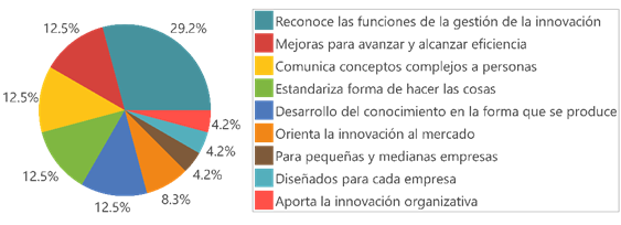 Contributions related to improvements to advance and achieve efficiency, communication of complex concepts to people, standardization in the way of doing things and development of knowledge in the way innovation is produced represent, each of them, the 12.5% of weight and are recognized in three identified models.