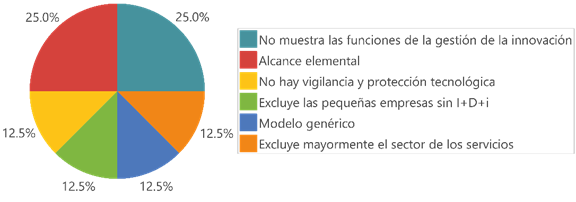 As shown in the figures, although these models recognize the functions of innovation management, they do not show it in the model itself and it is recognized by several authors as representing 25% as well as the elemental scope of some of the models among of them, that of basic functions of innovation management, which has an elementary scope, and the CIDEM model or the Generalitat de Catalunya Innovation Management Model, which does not explicitly show in its four macro functions those of innovation management, as well as the model in the Services Sector (MIS), a generic model and although it recognizes seven functions, it does not explicitly show those of innovation management.