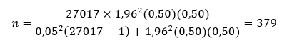 In the rural parishes of Posorja, Puná, Tenguel and Morro, a total of 27,017 people over 18 years of age reside, according to figures from the 2010 Population and Housing Census carried out by the National Institute of Statistics and Censuses of Ecuador. 55.1% live in Posorja, 9.8% in Morro, 12.2% in Puná and the remaining 22.9% in Tenguel. In this way, the population is classified as finite. The formula used to calculate the sample is the following: