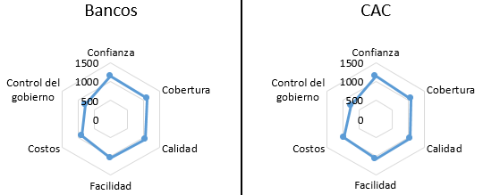 The banks' evaluation is relatively good in terms of trust (1142), quality (1064), coverage (1109) and ease of access (1031). Costs (891) and Government control (769), for their part, had a rather poor assessment. Similarly, CACs register a better score than banks in trust (1148), ease and costs (1070), but not with coverage (1075), quality (1053) or government control (741).
