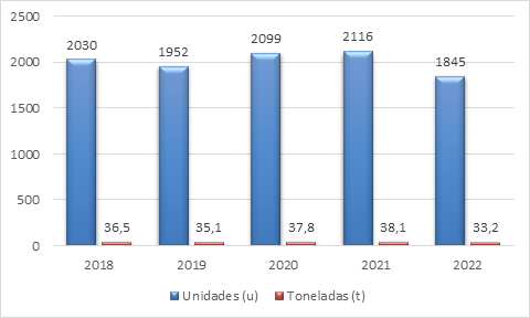 During the period between 2018 and 2022, as seen in figure 2, leather production was distributed as follows: in 2018, 2,030 units and 36.5 tons were reached, in 2019, 1,952 units and 35. 1 tons, in 2020, 2099 units and 37.8 tons were produced, in 2021 it rose to 2116 units and 38.1 tons and, finally, in 2022, 1845 units were reached, adding a total of 33.2 tons of leather.