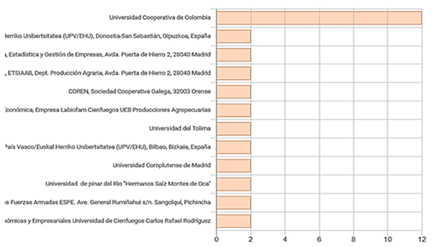 Production by affiliation of the authors has a favorable behavior for countries, such as: Colombia, Spain and Cuba. The Cooperative University of Colombia is the institution that has published the most on management problems in cooperative companies, in the period under investigation (see Figure 2).