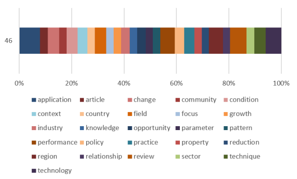 Of the 46 words with the highest occurrences (greater than 40 occurrences), the words with the highest frequency were: application, reviews, technology, action, region, techniques, practices, changes and policies with 116, 92, 87, 81, 79, 64, 62, 58 and 53 occurrences, respectively (Figure 4).