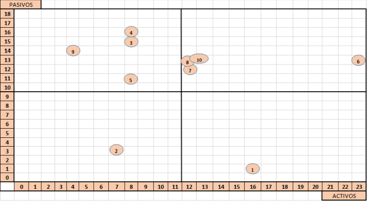 En el cuadrante II (pasivo), están los problemas: 3, 4, 5 y 9. Estos son problemas sin gran influencia causal sobre los demás, pero son causados por la mayoría. En el cuadrante IV (activo), se localiza el problema 1, que es de alta influencia sobre la mayoría de los restantes y, a su vez, es causado por otros. Jerarquizando las restricciones, se deben priorizar los problemas del cuadrante IV que son los activos, seguidos por los problemas del cuadrante I y tener en cuenta los problemas correspondientes al cuadrante II.