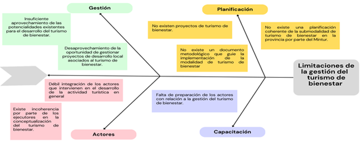 The Ishikawa diagram is made with the participation of 28 national actors (Council of the Municipal Administration of Guane, university professors from all over the country, specialists from the Ministry of Tourism at territorial and national level, professors from the hotel and tourism training centers at national level) and guided by two university professors with experience in workshops, where the workshop is carried out with the objective of identifying the variables that affected the limitations in the management of wellness tourism through brainstorming that develops teamwork. At first, the coordinators explained the Ishikawa diagram, posed the general problem, and from a brainstorming showed the results of the expert judgment method, grouping the limitations in four fundamental areas that would allow the development of actions to eradicate them.